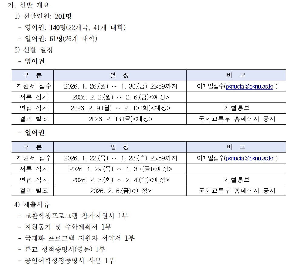 | 첨부파일 | 2026-2학기 영어권 파견 교환학생 모집 공고 및 대학 정보.zip 2026-2학기 일어권 파견 교환학생 모집 공고 및 대학 정보.zip 교환학생 프로그램 지원서(서식).hwp | ||