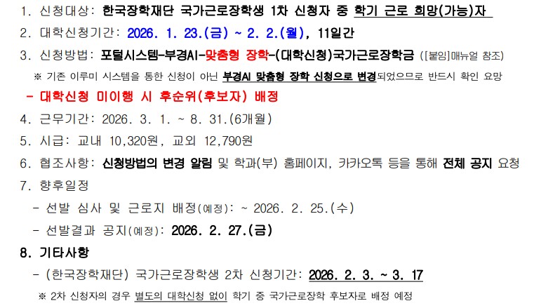 2026년도 1학기 국가근로장학금 대학신청 안내(연장)