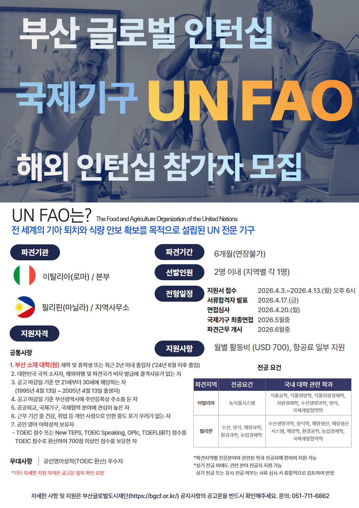 | 첨부파일 | 붙임 1. 「2026 부산 글로벌 인턴십」 모집 공고문 FATF Training Institute 부산.pdf 붙임 1. 「2026 부산 글로벌 인턴십」 모집 공고문_UN 식량농업기구 해외파견.pdf 붙임1. UN 식량농업기구 TOR_ATIO Support Intern_Rome Italy OIN.docx 붙임1. UN 식량농업기구 TOR_Fisheries_Manila Philippines.docx | ||